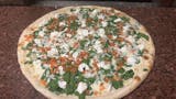 White pizza, fresh garlic, tomatoes, spinach, ricotta, and mozzarella cheese