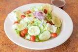 Tomato, onion, green olives and cucumber over iceberg lettuce.