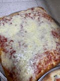 Thick crust square pizza with tomato sauce, mozzarella, and basil.
