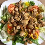 Grilled chicken, salad greens, tomato wedges, red onions &sweet peppers.