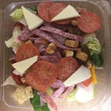 Salad greens, tomato wedges, hot & sweet peppers, green olives, salami, ham, onions, provolone, pepperoni & croutons.