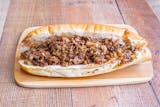 Philly steak sandwich with pizza sauce, sauteed vegetables, and sliced steak.