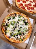 Green peppers, mushrooms, onions, black olives, broccoli, and extra cheese.