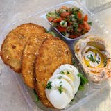 Homemade falafel balls, hummus, tomato cucumber salad & tahini. V.