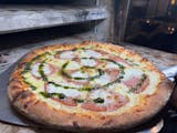 Thinly sliced mortadella topped with fresh mozzarella. Finished with a drizzle of our homemade pesto.