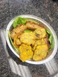 Carne frita (chicharron). Fried pork, (8) tostones, with amigo’s hot sauce on the side.
