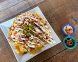 Queso, pico de gallo, sour cream, pickled jalapenos, shredded cheese, onions, and warm chips.