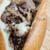 White pizza, steak, whiz, cooper, cherry peppers, fried onions.