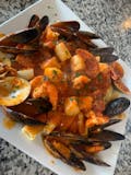 Shrimp, scallops, mussels, clams and calamari on a bed of linguini in a red or white sauce.