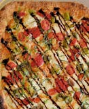 Thin white square pizza, roasted grape tomato, fresh mozzarella, roasted long hots, dollops of our marinara, roasted garlic cloves, balsamic reduction, fresh basil finished with a garlic parm crust.