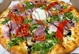 Mozzarella cheese, white sauce, roasted peppers, burrata cheese, arugula, prosciutto and balsamic glaze.