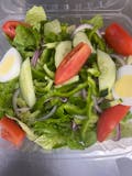 Iceberg and romaine lettuce, tomatoes, onions, green peppers, red cabbage and cucumber,egg ham, turkey and american cheese with choice of dressing.