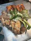 Hot Lava rock green salsa, beans, chihuahua cheese, ribeye, chicken, chorizo, shrimp, poblano pepper, cactus, scallions, corn tortillas.