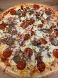 Onion, green pepper, mushroom, pepperoni, sausage, olives, cheese and sauce.