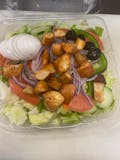 Lettuce, tomato, onions, cucumber, green pepper, olives and sweet peppers.