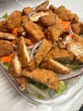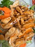 Our house salad with tomatoes,cucumbers,onions,carrots topped with fresh tuna fish.