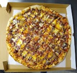 Sauce, mozzarella, provolone, cheddar, brisket, pork, bacon, BBQ sauce.