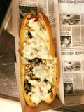 Cheesesteak, fried onions, American cheese, mozzarella cheese, cheese whiz, ketchup.