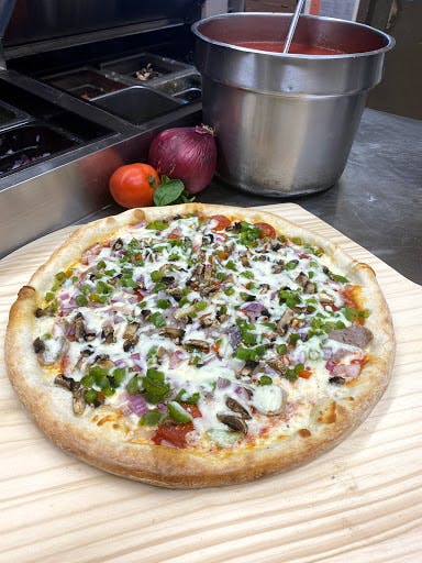 Steak, pepperoni, mushrooms, onions, mozzarella, American cheese & sauce.