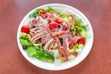 Hummus, lettuce, cucumber, green peppers, tomatoes, onions, roasted peppers, carrots, feta cheese & balsamic dressing.