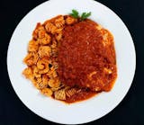 Breaded chicken and homemade pasta tossed in marinara sauce and covered with cheese.
