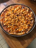 Breaded veal cutlet topped with melted cheese, Italian sausage, baked peppers, and tomato sauce served with pasta.