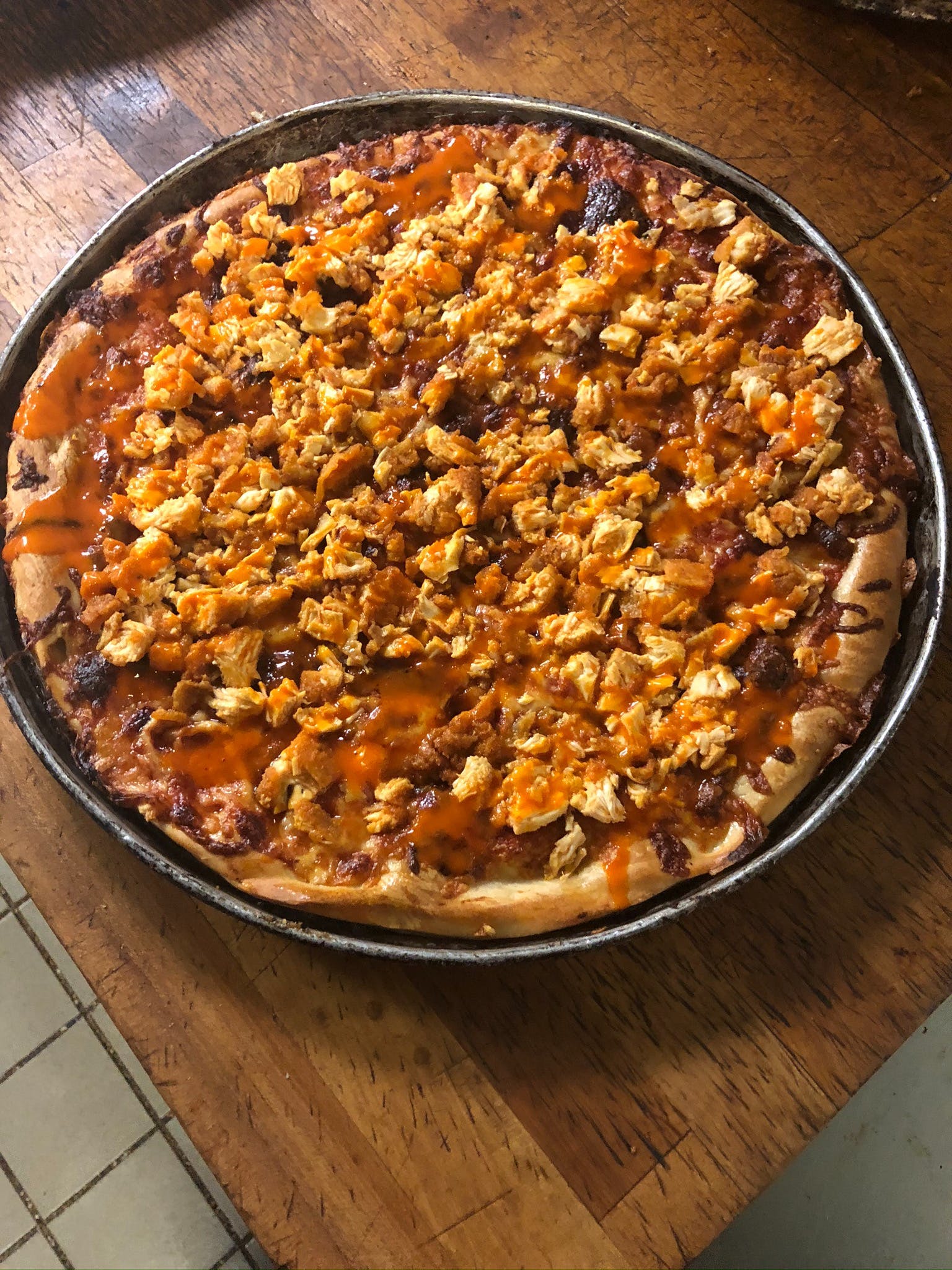 Toasted roll in the oven with melted provolone cheese. Then topped off with Buffalo chicken, blue cheese and shaved steak.
