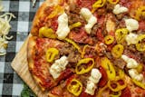 Marinara, pepperoni, Italian sausage, banana peppers, fresh mozzarella, side of balsamic glaze.