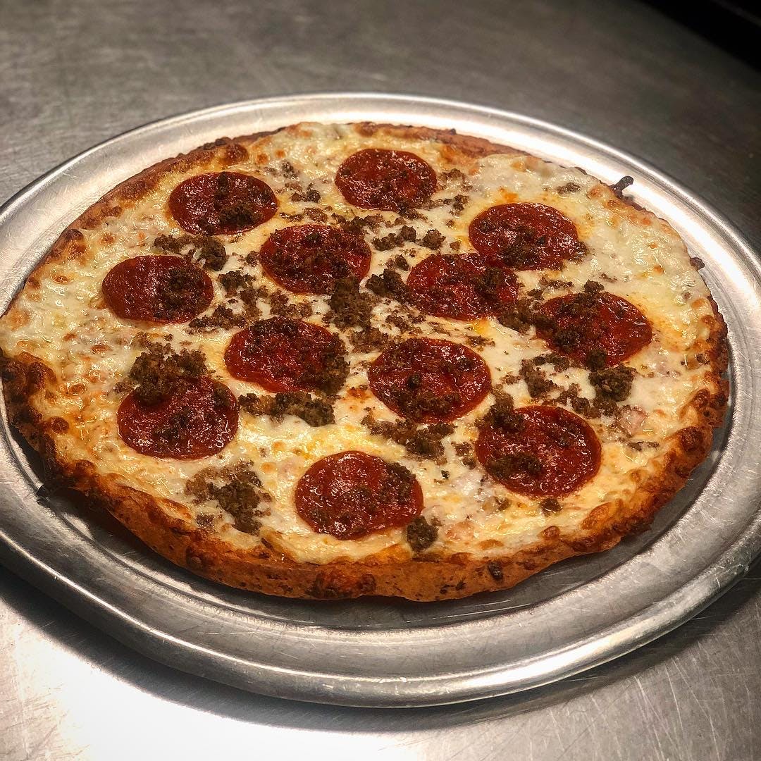 Rolled in pepperoni, sausage, green peppers, mushrooms, black olives, mozzarella cheeses & onions.
