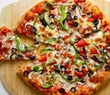Fresh tomato sauce, mushrooms, onions, green peppers, tomatoes and black olives.