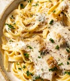 Parmesan cheese and alfredo cream sauce over fettucine pasta.