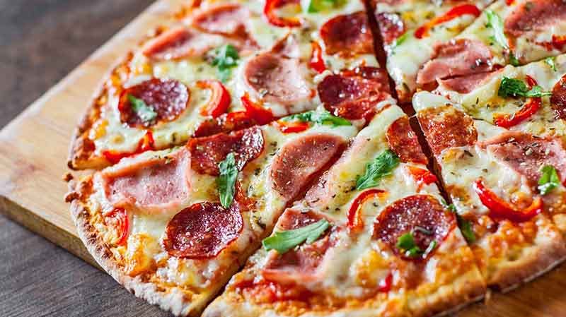 Pepperoni, ham, beef, sausage, bacon, ricotta and mozzarella cheese.