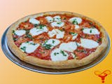Homemade pizza sauce, fresh mozzarella cheese, sliced tomato, fresh basil, olive oil.