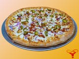 Fresh shredded mozzarella cheese, white garlic sauce, grilled chicken, bacon, jalapeno, red onion.