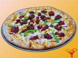 Homemade pizza sauce, fresh shredded mozzarella cheese, ham, pepperoni, sausage, bacon.