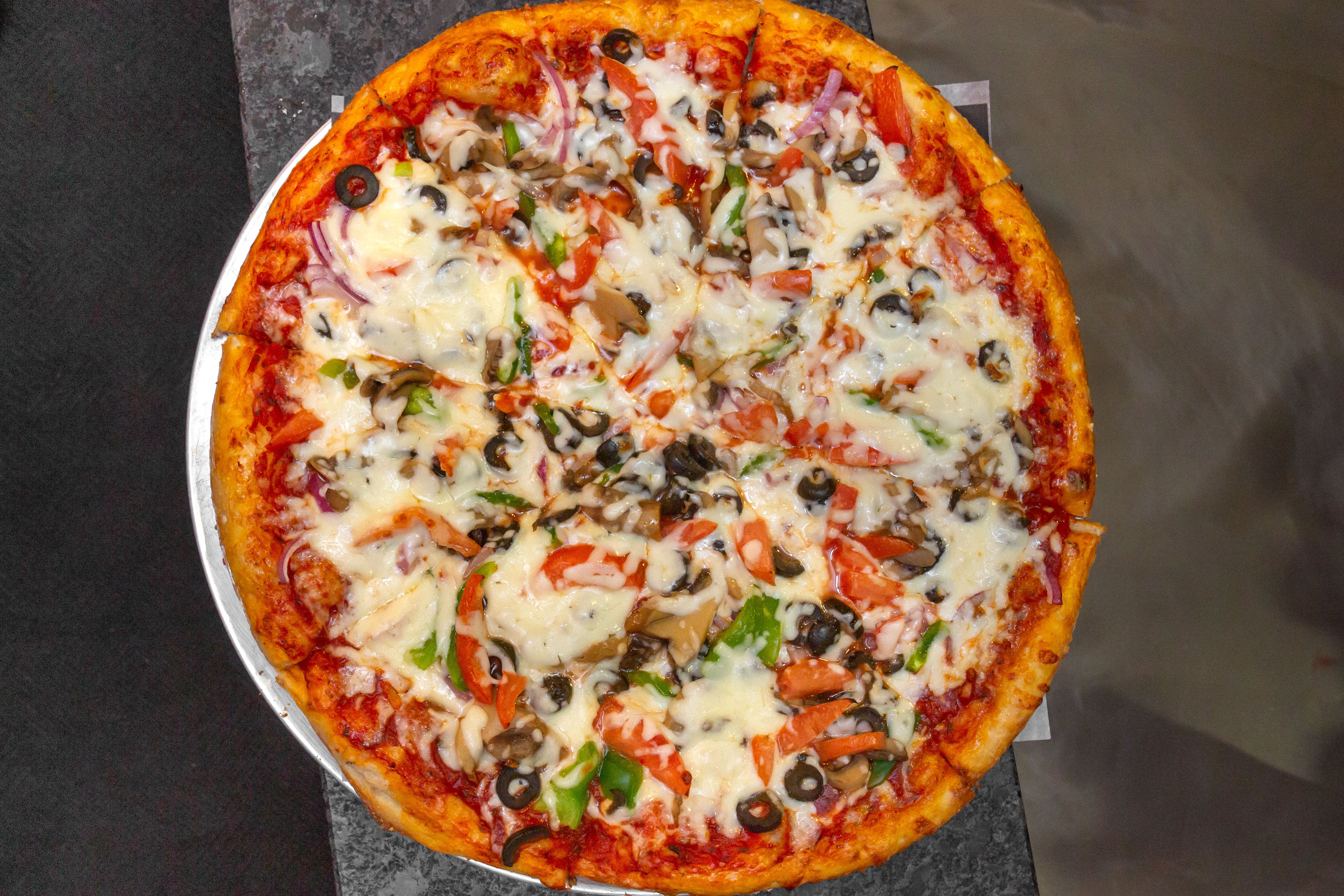 Green peppers, mushrooms, tomatoes, onions, black olives.