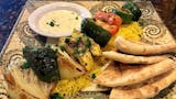 Selection of hummus, falafel, fattoush, baba ghanouge, and grape leaves served with pita. (Vegetarian)
