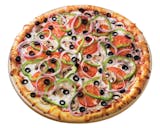 Fresh mushrooms, crisp green peppers, black olives, ripe tomatoes, red onions and Wisconsin mozzarella cheese on our private-labeled pizza sauce.