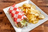Fresh ground chuck, grilled to perfection, topped with yellow American cheese and served on a hamburger bun with a side of fries.