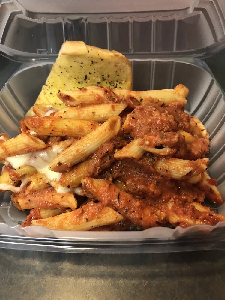 Ziti with mozzarella and tomato sauce baked to perfection in our oven.