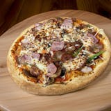 Pepperoni, sausage, ham, bacon, onions, green peppers, mushroom, tomato, olives.