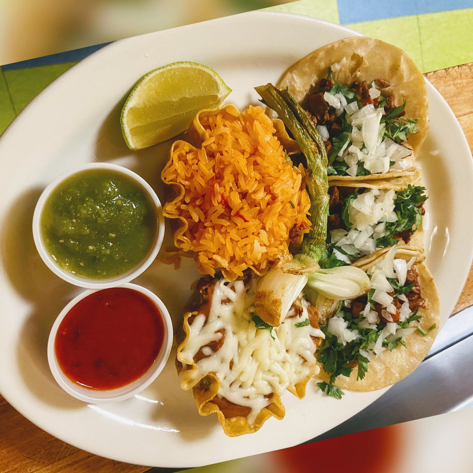 Two chimes soft or fried choice of shredded chicken or ground beef topped with cheese sauce.