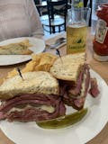 Rye bread, spicy mustard, hot pastrami, corned beef and swiss cheese.