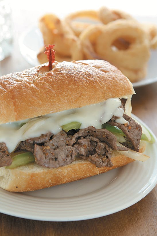 Mayonnaise, provolone, American and mozzarella cheese, steak topped with lettuce, tomato, and grilled onions.